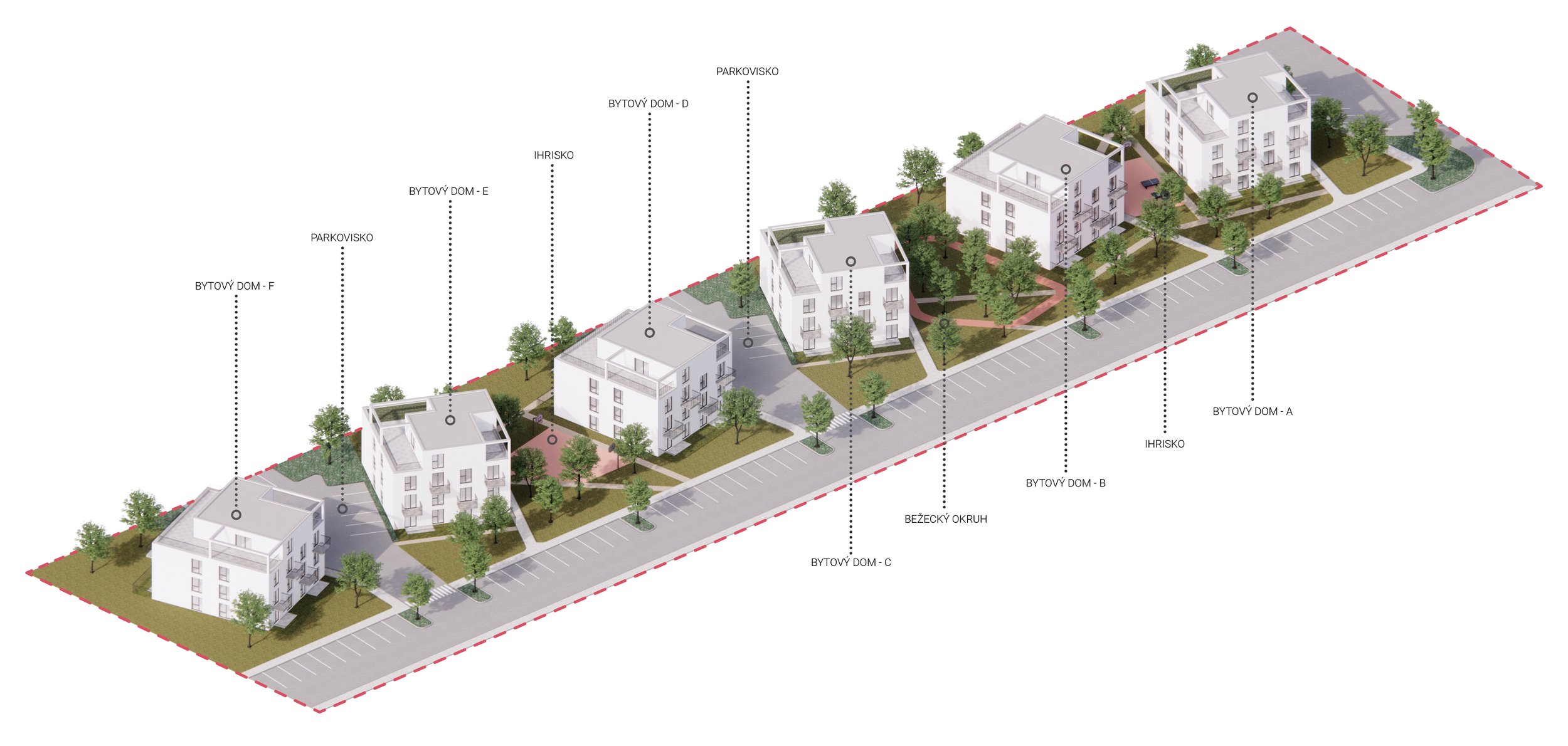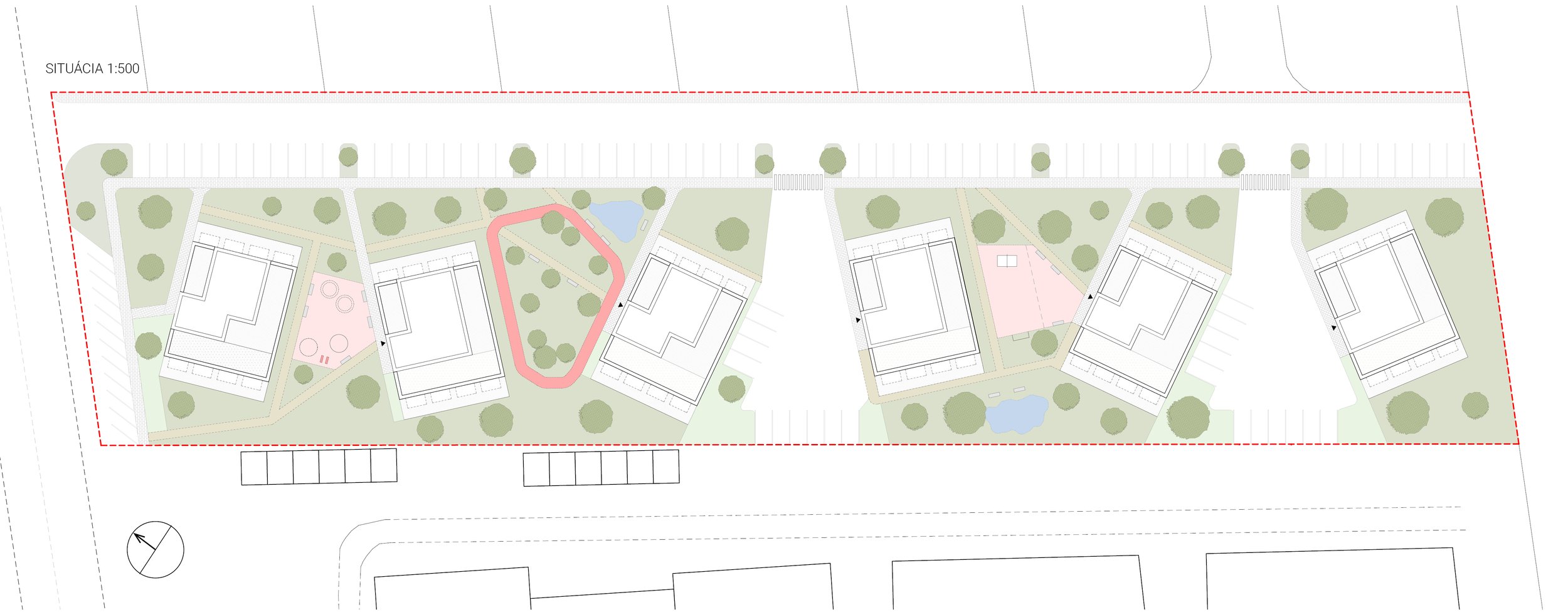 Jednotlivé budovy sú natočené tak, aby medzi nimi vznikali atraktívne priestory pre zeleň, šport a oddych. Vzniká tak parčík, akýsi filter medzi viac podlažnou zástavbou na okraji obce a pripravovanou výstavbou rodinných domov