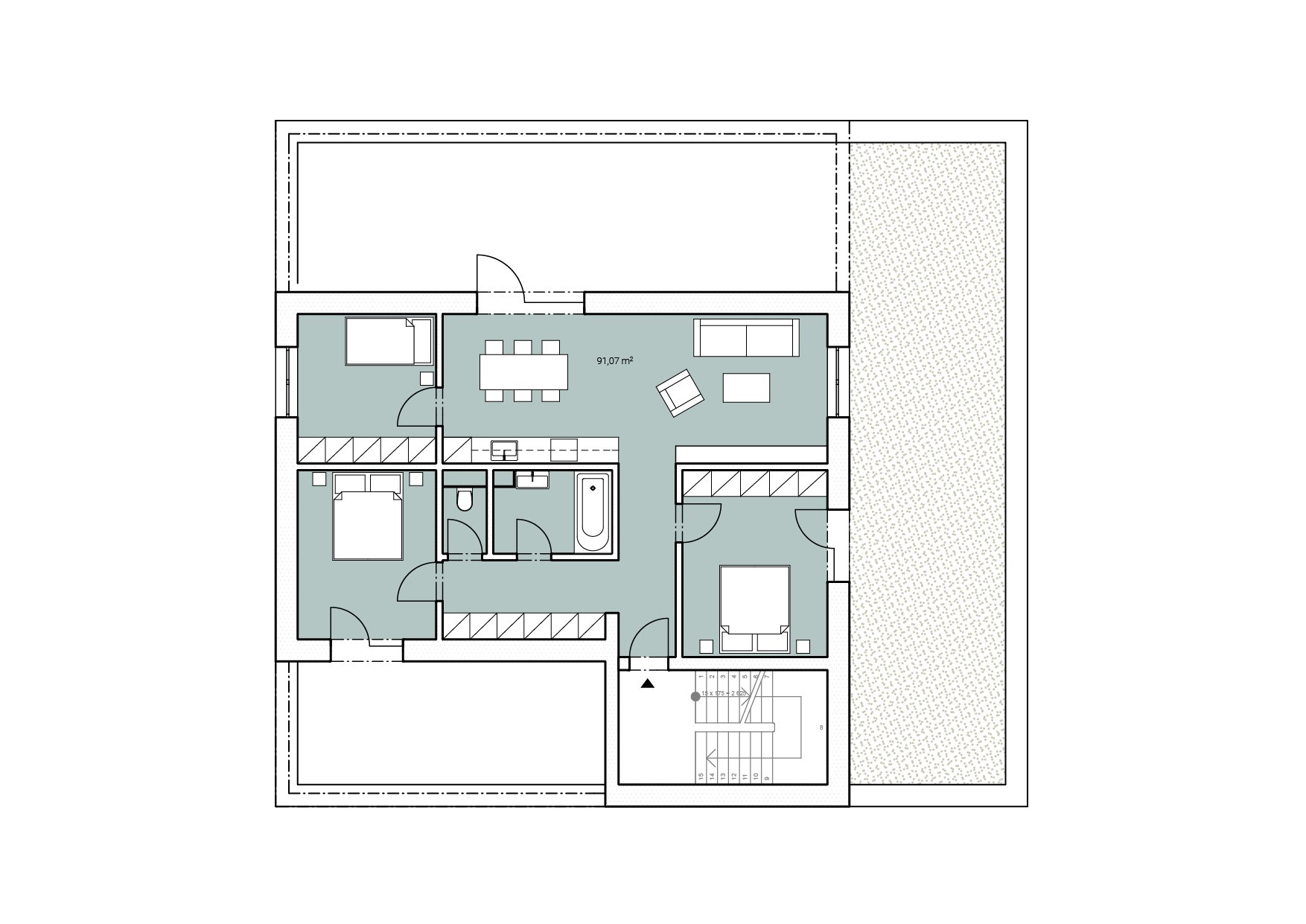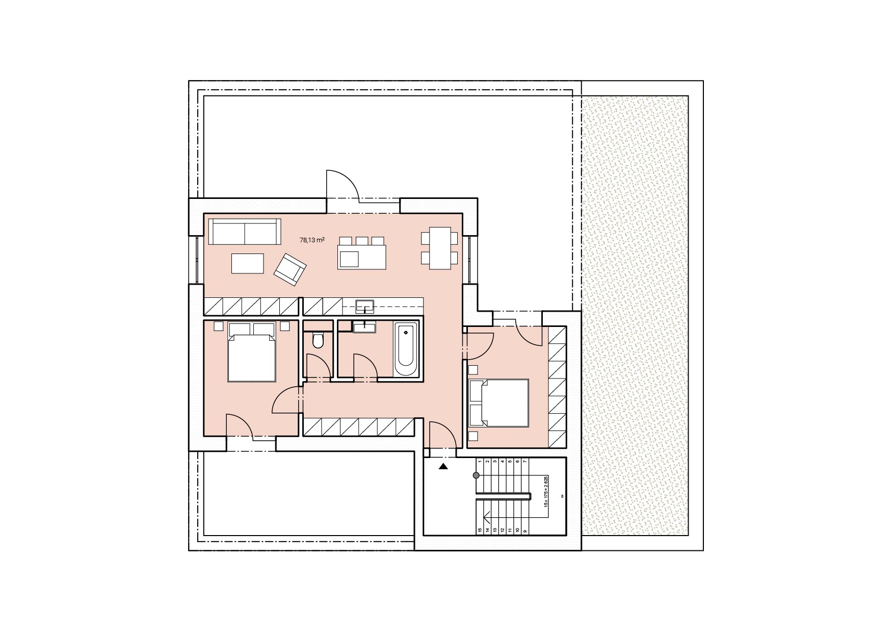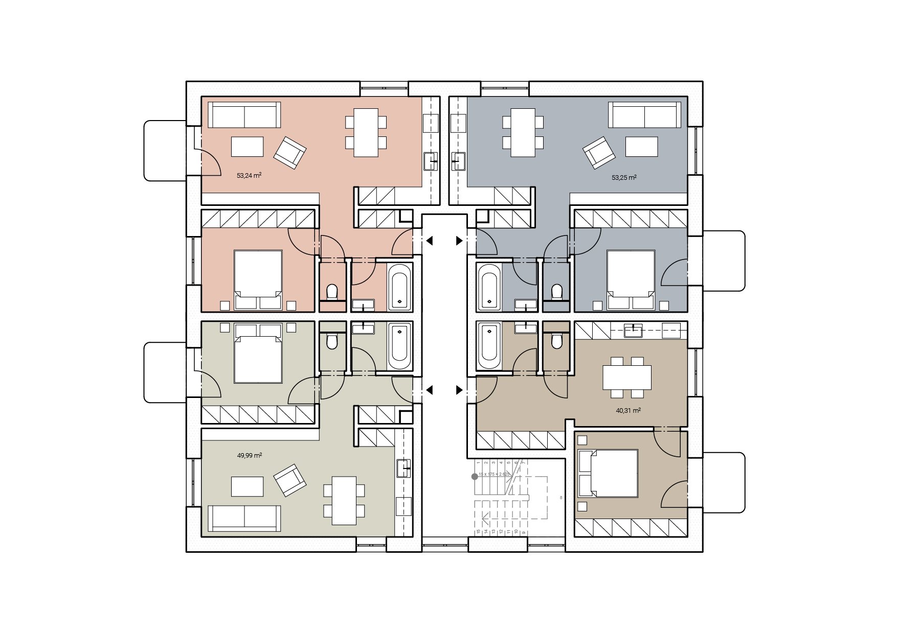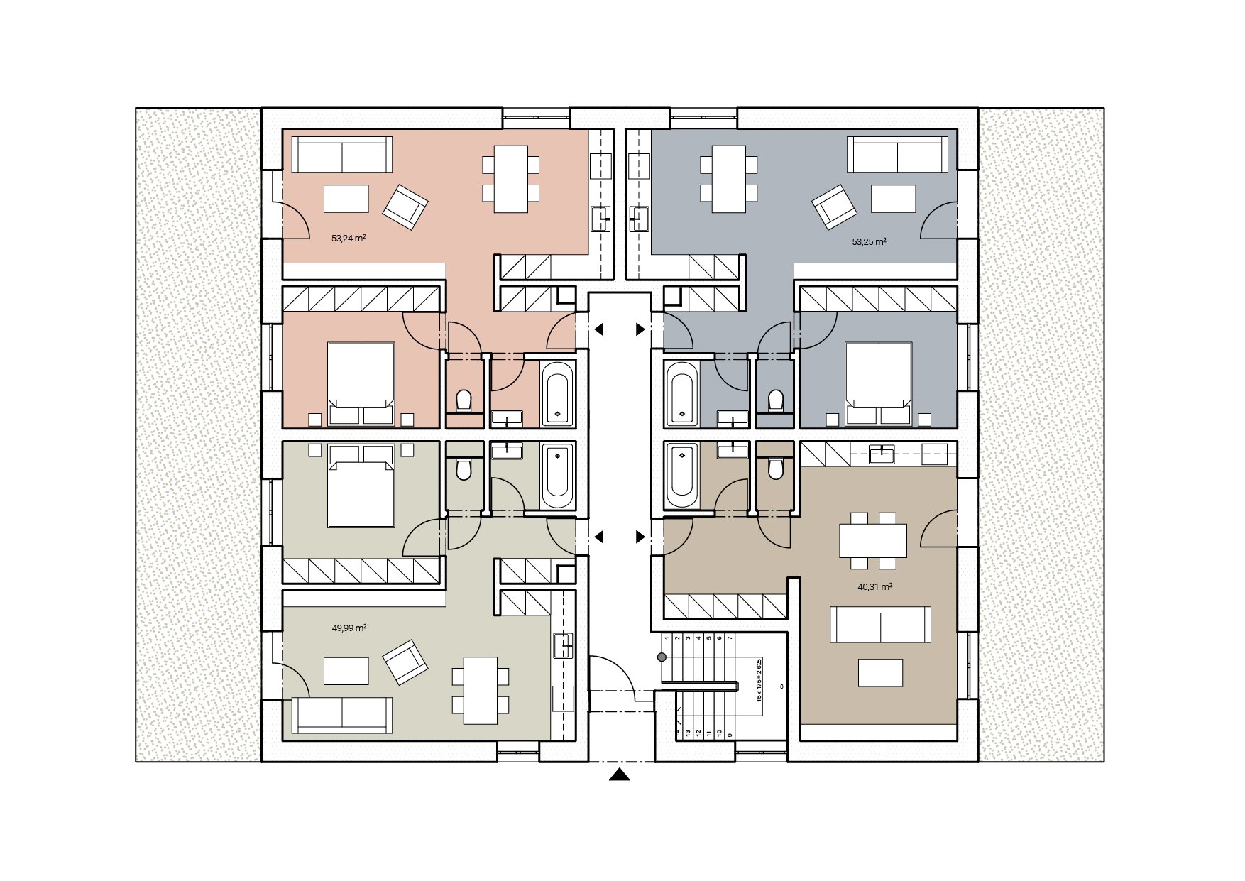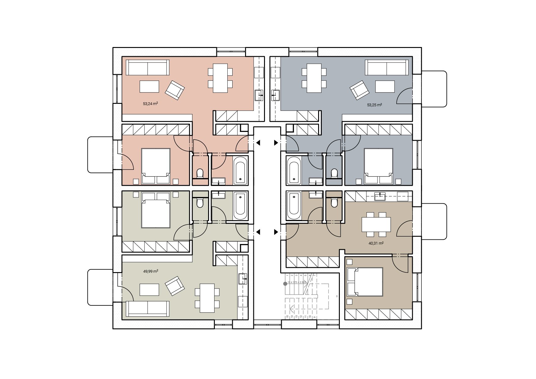 Kombináciu dvojizbových a jednoizbových bytov na troch nadzemných podlažiach, dopĺňajú veľkorysé trojizbové, prípadne štvorizbové byty na štvrtom, ustúpenom podlaží.