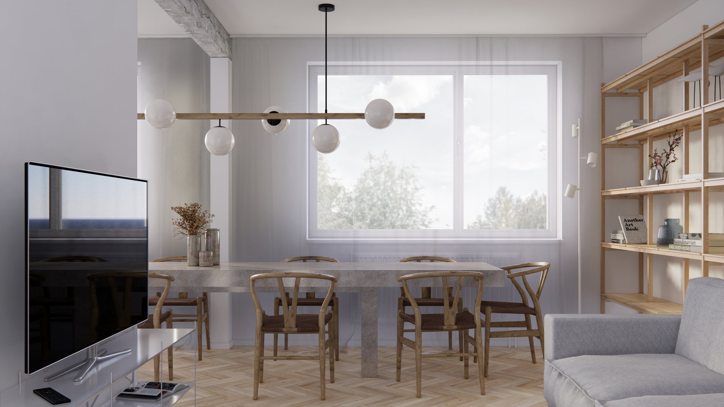 Vzniká vzdušný priestor s masívnym, dlhým stolom - centrom celého bytu.
