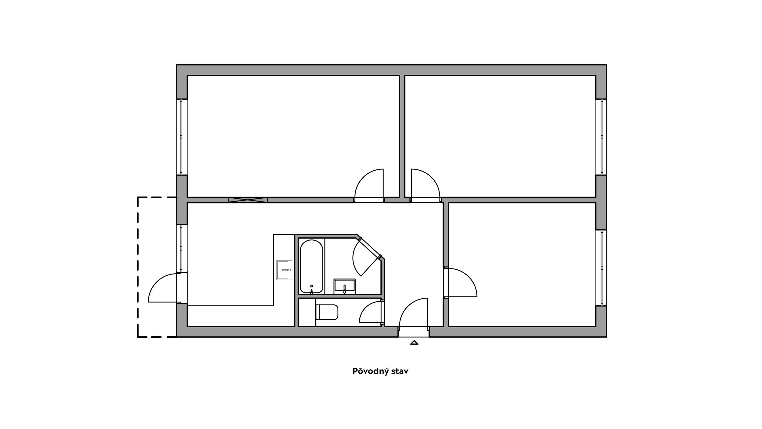 Návrh bytu v typickom panelovom dome z 80. rokov. Kuchyňu a obývaciu izbu dispozične prepájame rozšírením otvoru v mieste pôvodných, zamurovaných dverí.