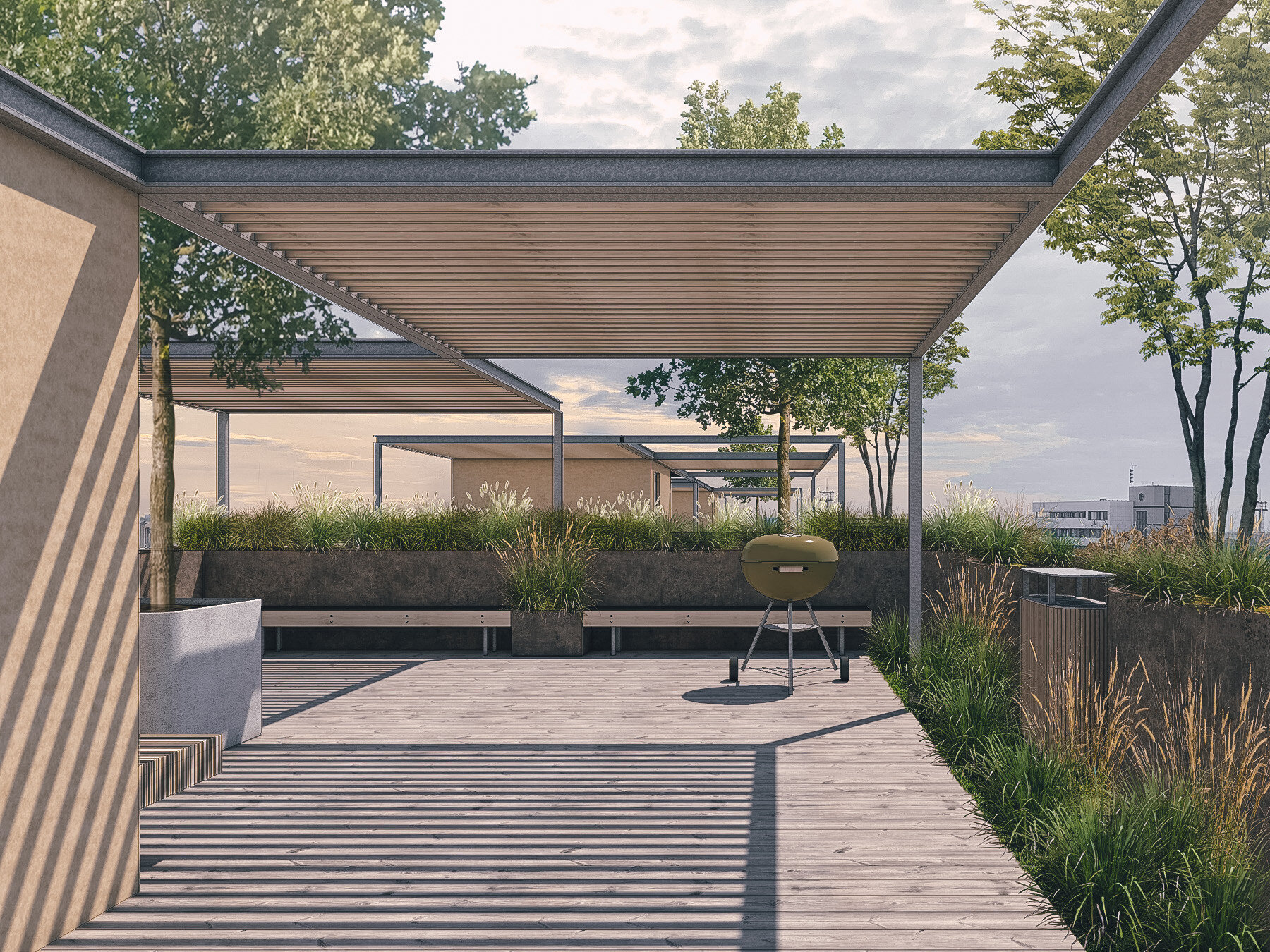Zeleň dopĺňa, oddeluje a filtruje terasy, racionálne oddelené podľa príslušných vchodov. Zlepšuje sa klíma vnútorných priestorov, vegetácia je prirodzeným izolantom pred chladom v zime a teplom v horúcich letných dňoch. V neposlednom rade vzniká možnosť na umiestnenie a chov včiel a včelých úľov na strechách obytných súborov.